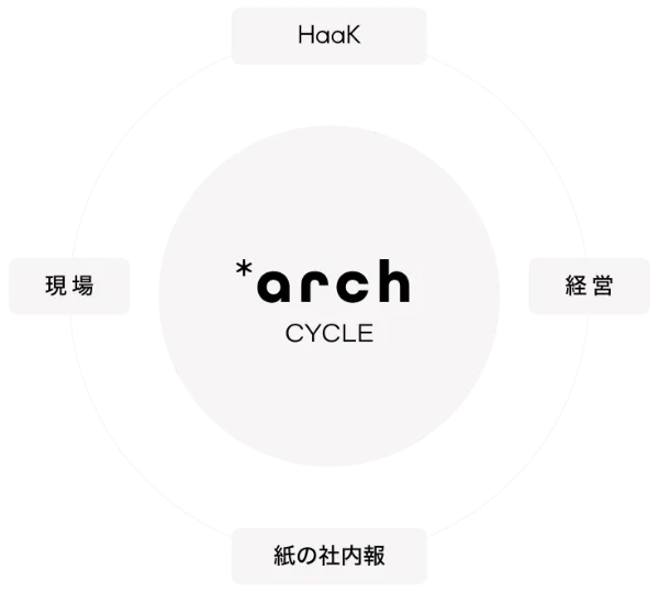 従来の社内報は一方通行でした。archは現場の声をAIサーベイ(HaaK)で収集・AI分析し、その知見を紙社内報で全従業員に浸透させる双方向サイクルです。